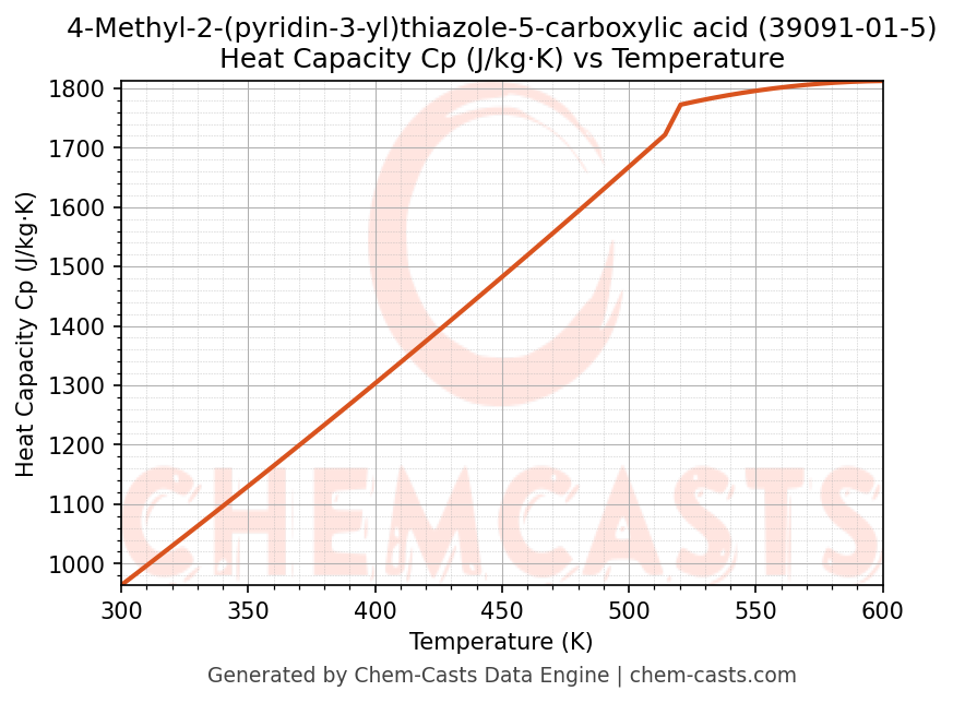 - Specific heat capacity (Cp) indicates the amount of energy required to raise the temperature of 4-Methyl-2-(pyridin-3-yl)thiazole-5-carboxylic acid and is critical for energy balance and heat-exchanger design.
