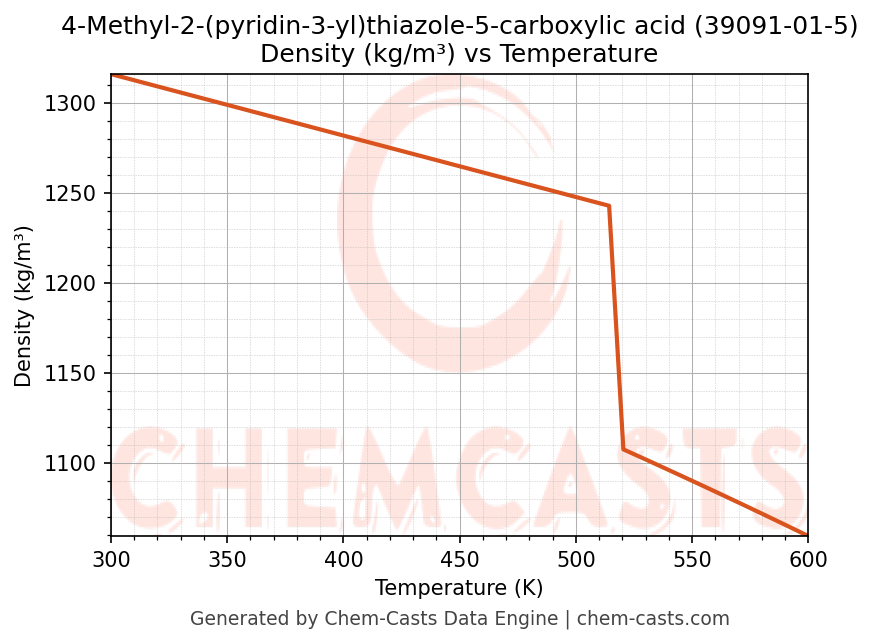 This page presents the temperature-dependent thermodynamic and transport properties of 4-Methyl-2-(pyridin-3-yl)thiazole-5-carboxylic acid (CAS 39091-01-5) calculated at a constant pressure of 1 atm (101325 Pa) over the temperature range 250-500 K.