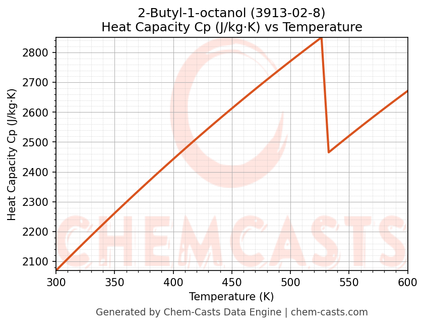 - Specific heat capacity (Cp) indicates the amount of energy required to raise the temperature of 2-Butyl-1-octanol and is critical for energy balance and heat-exchanger design.