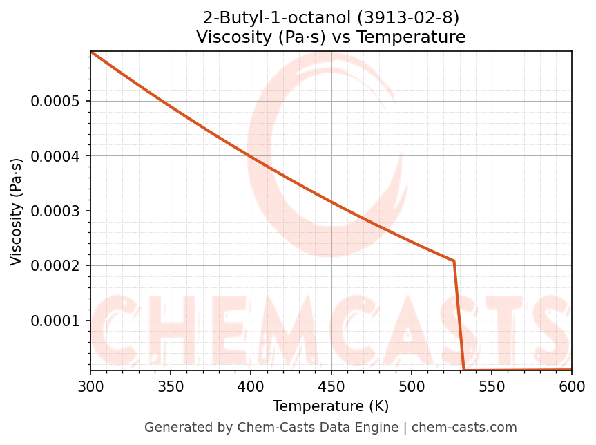 This page presents the temperature-dependent thermodynamic and transport properties of 2-Butyl-1-octanol (CAS 3913-02-8) calculated at a constant pressure of 1 atm (101325 Pa) over the temperature range 250-500 K.
