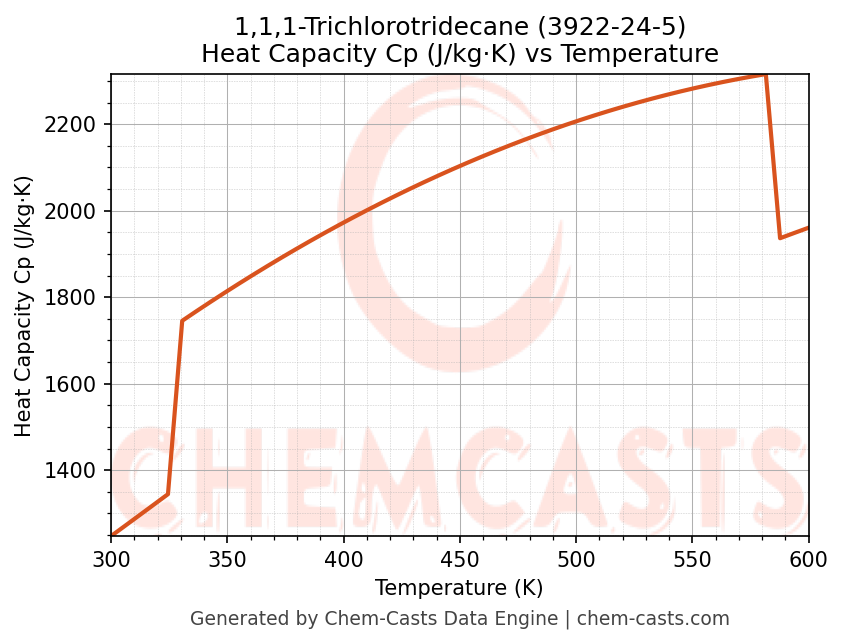 - Specific heat capacity (Cp) indicates the amount of energy required to raise the temperature of 1,1,1-Trichlorotridecane and is critical for energy balance and heat-exchanger design.
