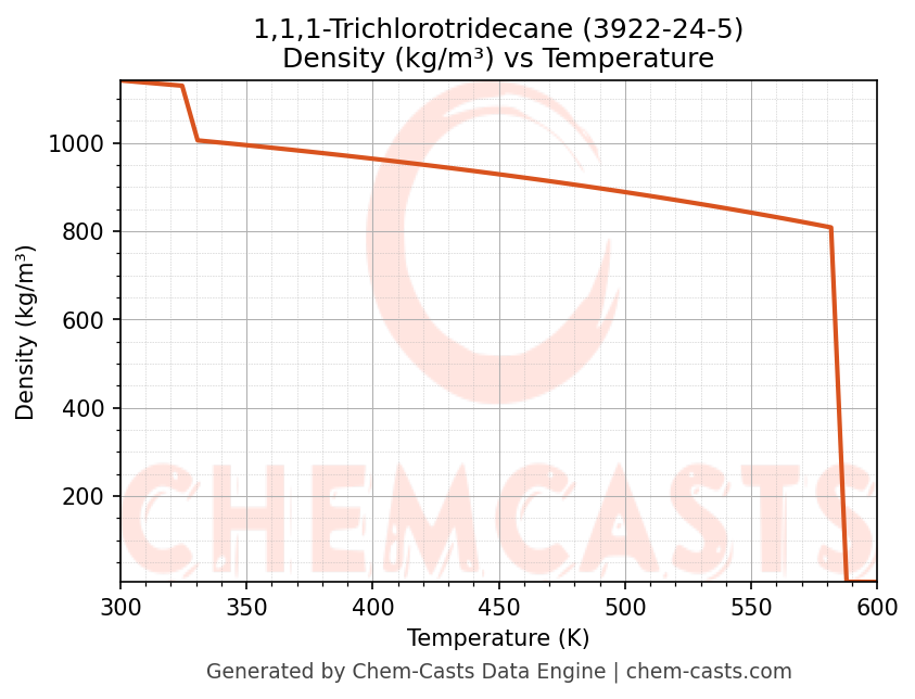 This page presents the temperature-dependent thermodynamic and transport properties of 1,1,1-Trichlorotridecane (CAS 3922-24-5) calculated at a constant pressure of 1 atm (101325 Pa) over the temperature range 250-500 K.