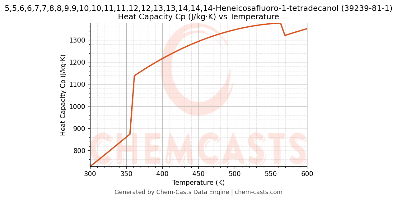 - Specific heat capacity (Cp) indicates the amount of energy required to raise the temperature of 5,5,6,6,7,7,8,8,9,9,10,10,11,11,12,12,13,13,14,14,14-Heneicosafluoro-1-tetradecanol and is critical for energy balance and heat-exchanger design.