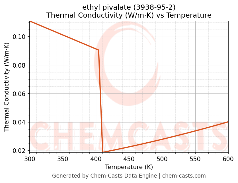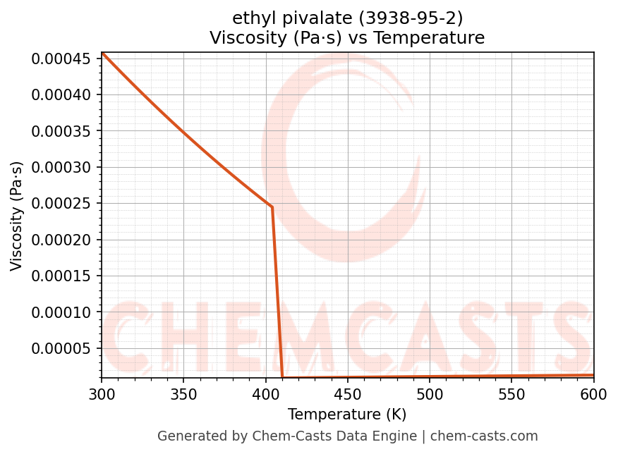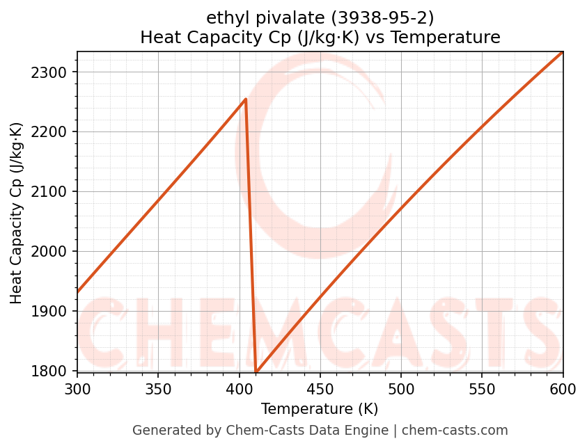 This page presents the temperature-dependent thermodynamic and transport properties of ethyl pivalate (CAS 3938-95-2) calculated at a constant pressure of 1 atm (101325 Pa) over the temperature range 250-500 K.