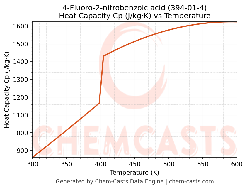 - Specific heat capacity (Cp) indicates the amount of energy required to raise the temperature of 4-Fluoro-2-nitrobenzoic acid and is critical for energy balance and heat-exchanger design.