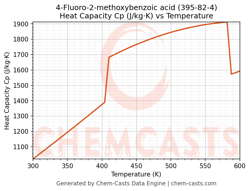 - Specific heat capacity (Cp) indicates the amount of energy required to raise the temperature of 4-Fluoro-2-methoxybenzoic acid and is critical for energy balance and heat-exchanger design.