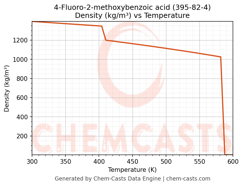 This page presents the temperature-dependent thermodynamic and transport properties of 4-Fluoro-2-methoxybenzoic acid (CAS 395-82-4) calculated at a constant pressure of 1 atm (101325 Pa) over the temperature range 250-500 K.