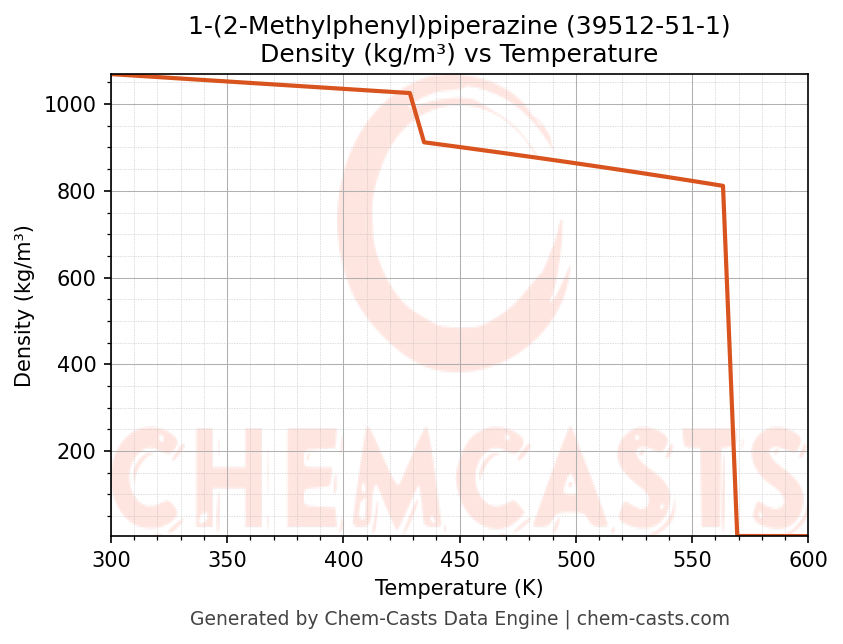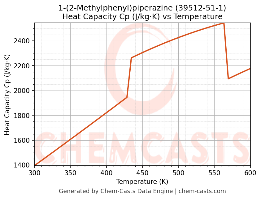 This page presents the temperature-dependent thermodynamic and transport properties of 1-(2-Methylphenyl)piperazine (CAS 39512-51-1) calculated at a constant pressure of 1 atm (101325 Pa) over the temperature range 250-500 K.