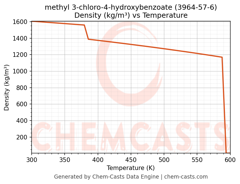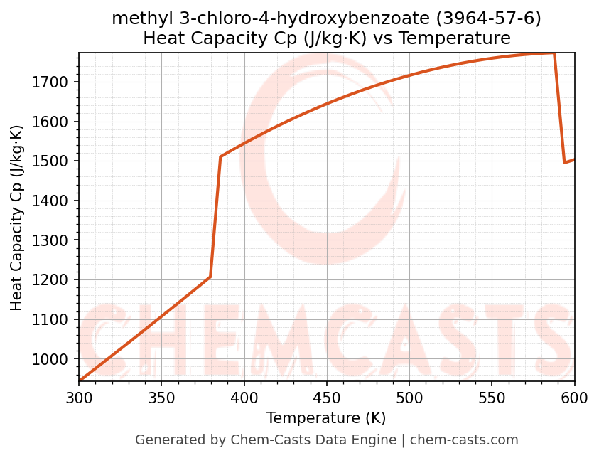 This page presents the temperature-dependent thermodynamic and transport properties of methyl 3-chloro-4-hydroxybenzoate (CAS 3964-57-6) calculated at a constant pressure of 1 atm (101325 Pa) over the temperature range 250-500 K.