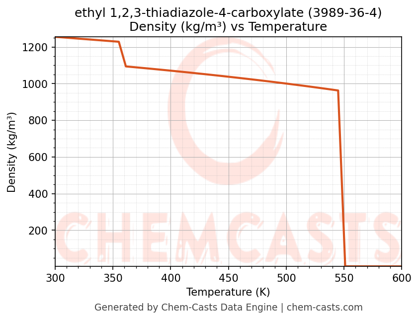 This page presents the temperature-dependent thermodynamic and transport properties of ethyl 1,2,3-thiadiazole-4-carboxylate (CAS 3989-36-4) calculated at a constant pressure of 1 atm (101325 Pa) over the temperature range 250-500 K.