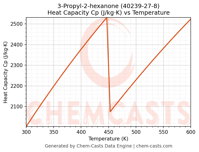 - Specific heat capacity (Cp) indicates the amount of energy required to raise the temperature of 3-Propyl-2-hexanone and is critical for energy balance and heat-exchanger design.