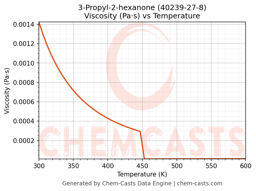 This page presents the temperature-dependent thermodynamic and transport properties of 3-Propyl-2-hexanone (CAS 40239-27-8) calculated at a constant pressure of 1 atm (101325 Pa) over the temperature range 250-500 K.