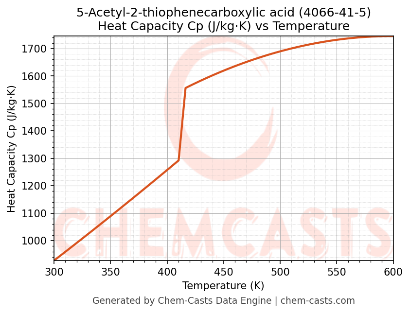 - Specific heat capacity (Cp) indicates the amount of energy required to raise the temperature of 5-Acetyl-2-thiophenecarboxylic acid and is critical for energy balance and heat-exchanger design.