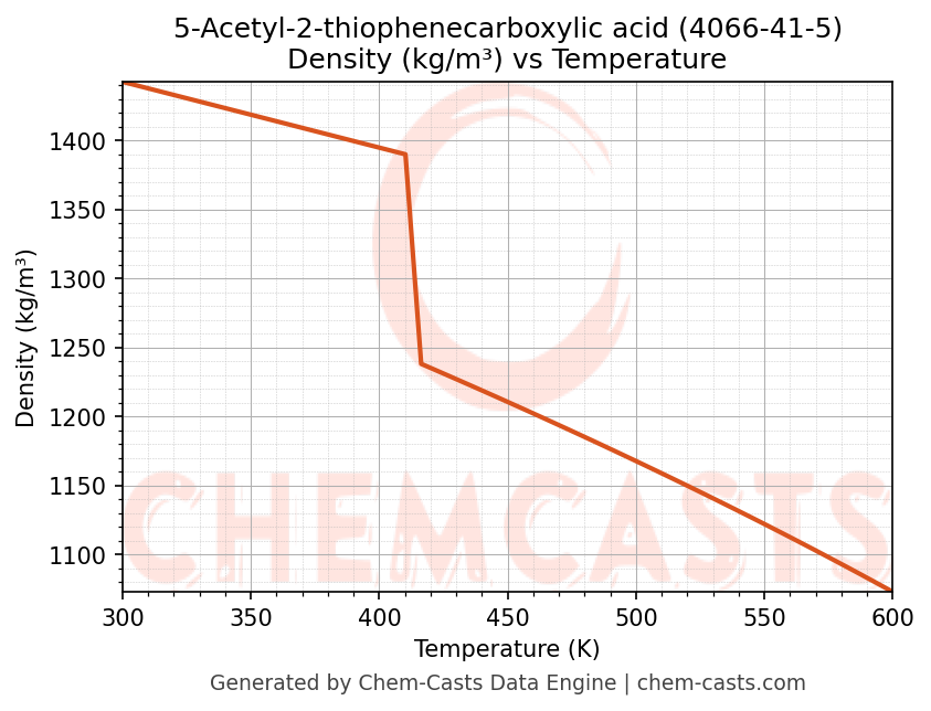 This page presents the temperature-dependent thermodynamic and transport properties of 5-Acetyl-2-thiophenecarboxylic acid (CAS 4066-41-5) calculated at a constant pressure of 1 atm (101325 Pa) over the temperature range 250-500 K.