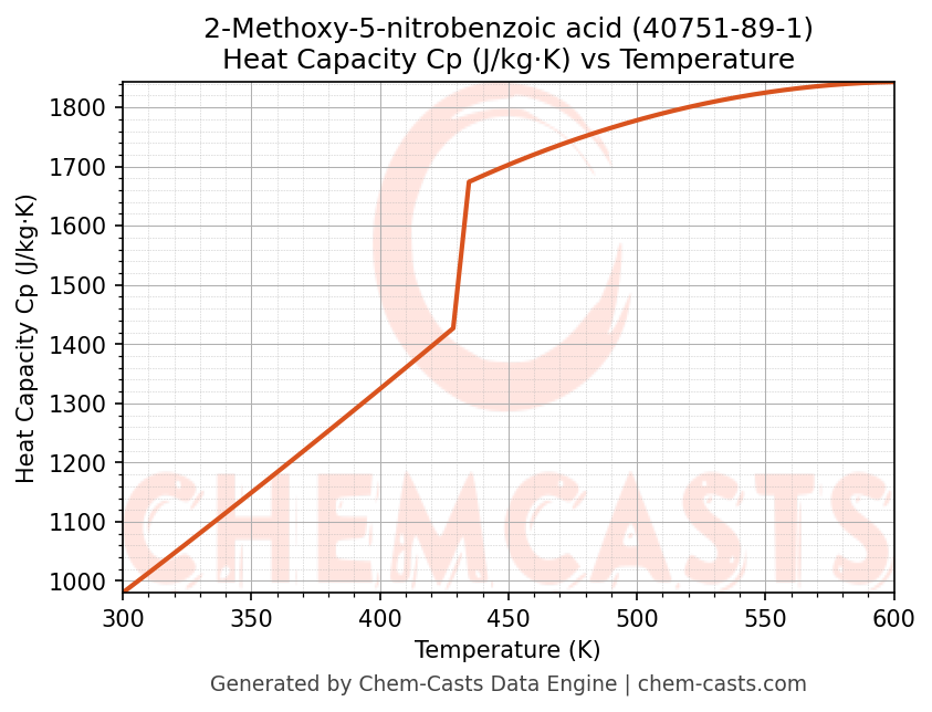 - Specific heat capacity (Cp) indicates the amount of energy required to raise the temperature of 2-Methoxy-5-nitrobenzoic acid and is critical for energy balance and heat-exchanger design.