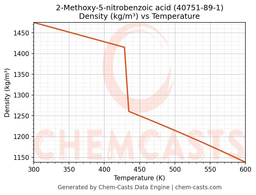 This page presents the temperature-dependent thermodynamic and transport properties of 2-Methoxy-5-nitrobenzoic acid (CAS 40751-89-1) calculated at a constant pressure of 1 atm (101325 Pa) over the temperature range 250-500 K.
