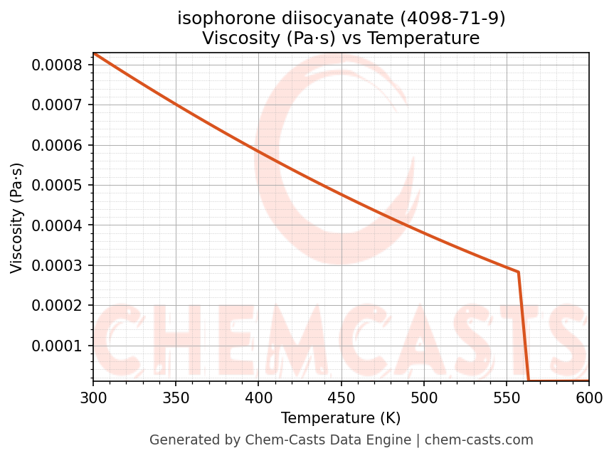 This page presents the temperature-dependent thermodynamic and transport properties of isophorone diisocyanate (CAS 4098-71-9) calculated at a constant pressure of 1 atm (101325 Pa) over the temperature range 250-500 K.