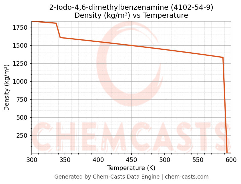This page presents the temperature-dependent thermodynamic and transport properties of 2-Iodo-4,6-dimethylbenzenamine (CAS 4102-54-9) calculated at a constant pressure of 1 atm (101325 Pa) over the temperature range 250-500 K.