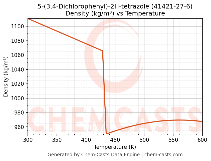 This page presents the temperature-dependent thermodynamic and transport properties of 5-(3,4-Dichlorophenyl)-2H-tetrazole (CAS 41421-27-6) calculated at a constant pressure of 1 atm (101325 Pa) over the temperature range 250-500 K.