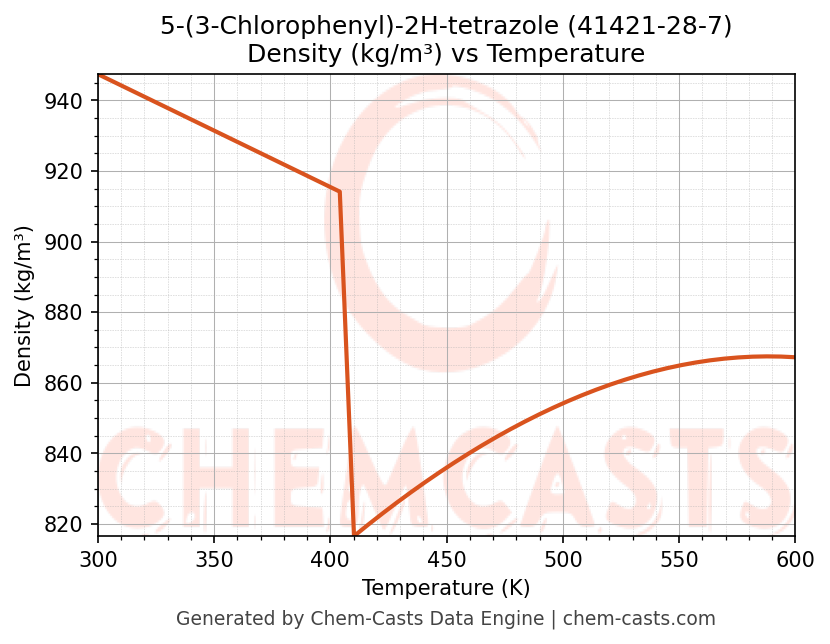 This page presents the temperature-dependent thermodynamic and transport properties of 5-(3-Chlorophenyl)-2H-tetrazole (CAS 41421-28-7) calculated at a constant pressure of 1 atm (101325 Pa) over the temperature range 250-500 K.