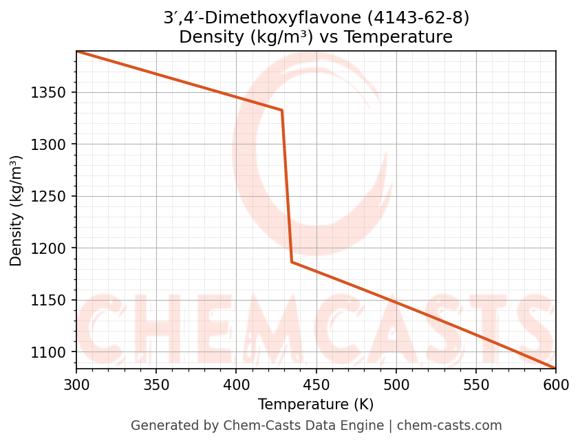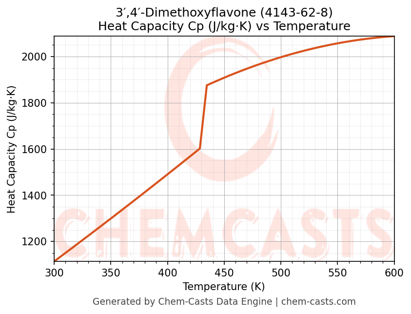 - Specific heat capacity (Cp) indicates the amount of energy required to raise the temperature of 3′,4′-Dimethoxyflavone and is critical for energy balance and heat-exchanger design.