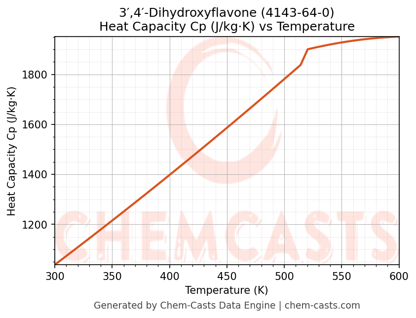 - Specific heat capacity (Cp) indicates the amount of energy required to raise the temperature of 3′,4′-Dihydroxyflavone and is critical for energy balance and heat-exchanger design.