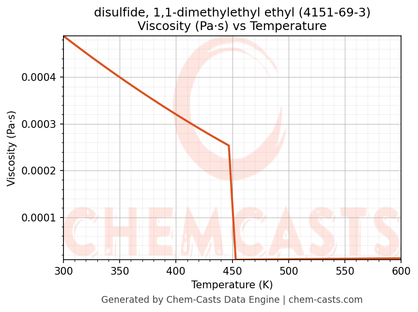 This page presents the temperature-dependent thermodynamic and transport properties of disulfide, 1,1-dimethylethyl ethyl (CAS 4151-69-3) calculated at a constant pressure of 1 atm (101325 Pa) over the temperature range 250-500 K.