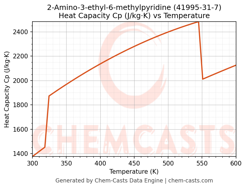 This page presents the temperature-dependent thermodynamic and transport properties of 2-Amino-3-ethyl-6-methylpyridine (CAS 41995-31-7) calculated at a constant pressure of 1 atm (101325 Pa) over the temperature range 250-500 K.