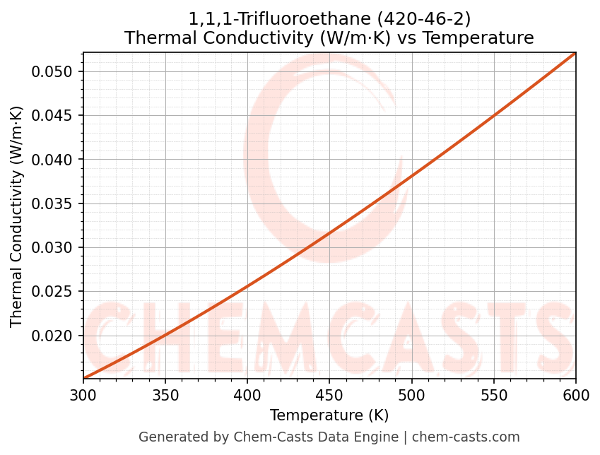 This page presents the temperature-dependent thermodynamic and transport properties of 1,1,1-Trifluoroethane (CAS 420-46-2) calculated at a constant pressure of 1 atm (101325 Pa) over the temperature range 250-500 K.