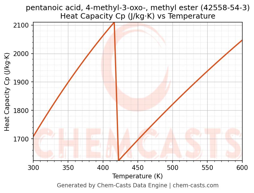 - Specific heat capacity (Cp) indicates the amount of energy required to raise the temperature of pentanoic acid, 4-methyl-3-oxo-, methyl ester and is critical for energy balance and heat-exchanger design.