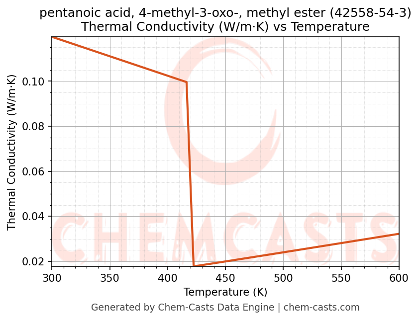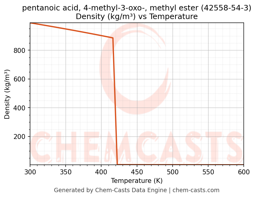 This page presents the temperature-dependent thermodynamic and transport properties of pentanoic acid, 4-methyl-3-oxo-, methyl ester (CAS 42558-54-3) calculated at a constant pressure of 1 atm (101325 Pa) over the temperature range 250-500 K.