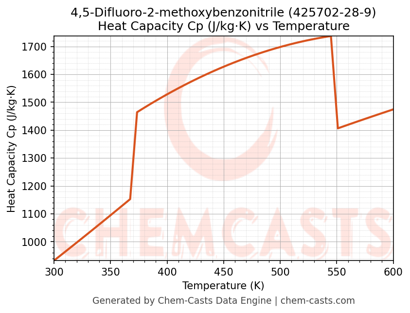- Specific heat capacity (Cp) indicates the amount of energy required to raise the temperature of 4,5-Difluoro-2-methoxybenzonitrile and is critical for energy balance and heat-exchanger design.