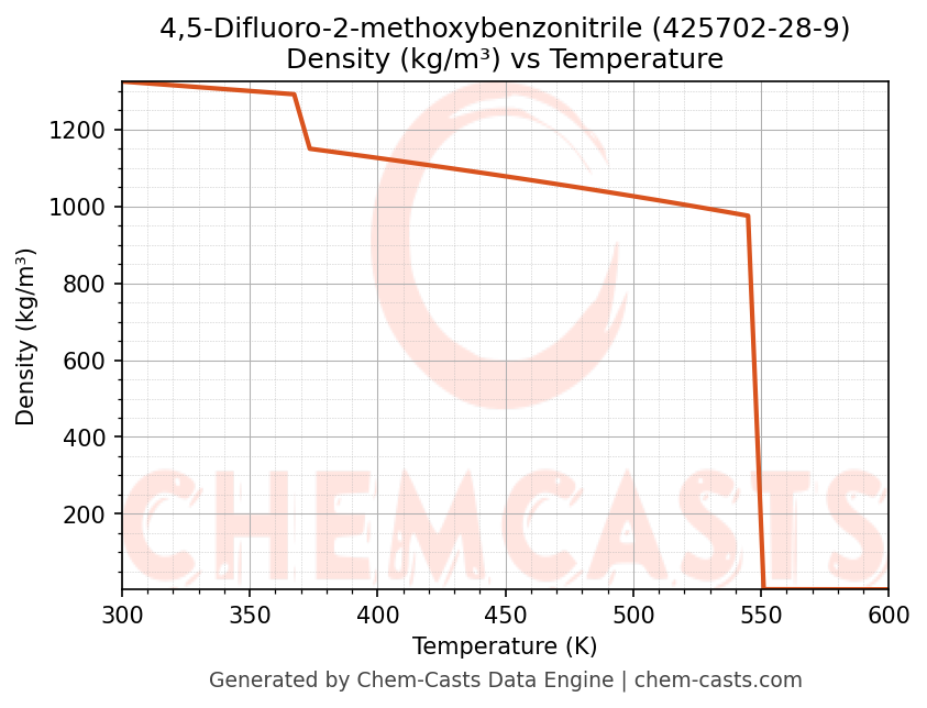 This page presents the temperature-dependent thermodynamic and transport properties of 4,5-Difluoro-2-methoxybenzonitrile (CAS 425702-28-9) calculated at a constant pressure of 1 atm (101325 Pa) over the temperature range 250-500 K.