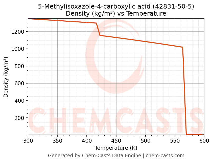 This page presents the temperature-dependent thermodynamic and transport properties of 5-Methylisoxazole-4-carboxylic acid (CAS 42831-50-5) calculated at a constant pressure of 1 atm (101325 Pa) over the temperature range 250-500 K.