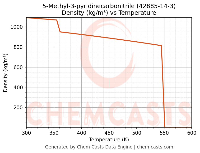 This page presents the temperature-dependent thermodynamic and transport properties of 5-Methyl-3-pyridinecarbonitrile (CAS 42885-14-3) calculated at a constant pressure of 1 atm (101325 Pa) over the temperature range 250-500 K.