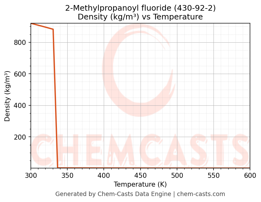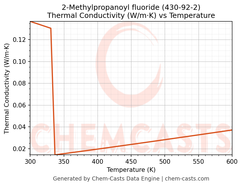 This page presents the temperature-dependent thermodynamic and transport properties of 2-Methylpropanoyl fluoride (CAS 430-92-2) calculated at a constant pressure of 1 atm (101325 Pa) over the temperature range 250-500 K.