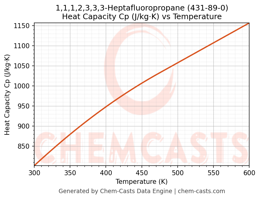 - Specific heat capacity (Cp) indicates the amount of energy required to raise the temperature of 1,1,1,2,3,3,3-Heptafluoropropane and is critical for energy balance and heat-exchanger design.