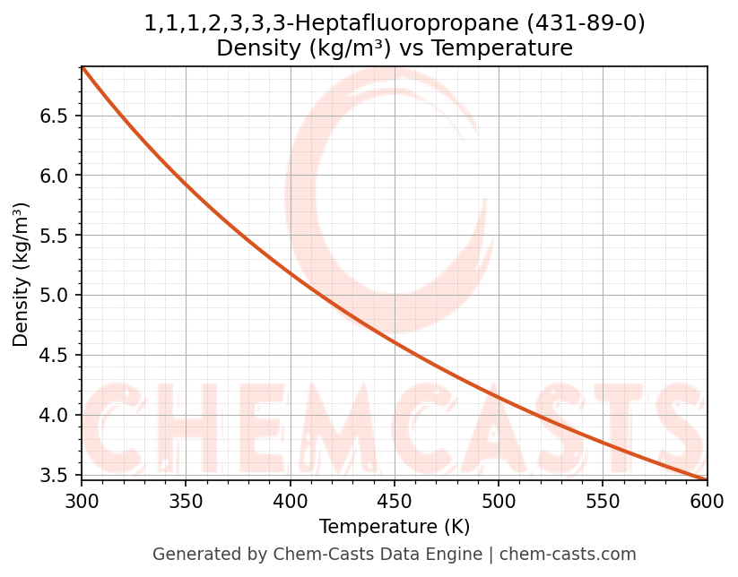 This page presents the temperature-dependent thermodynamic and transport properties of 1,1,1,2,3,3,3-Heptafluoropropane (CAS 431-89-0) calculated at a constant pressure of 1 atm (101325 Pa) over the temperature range 250-500 K.