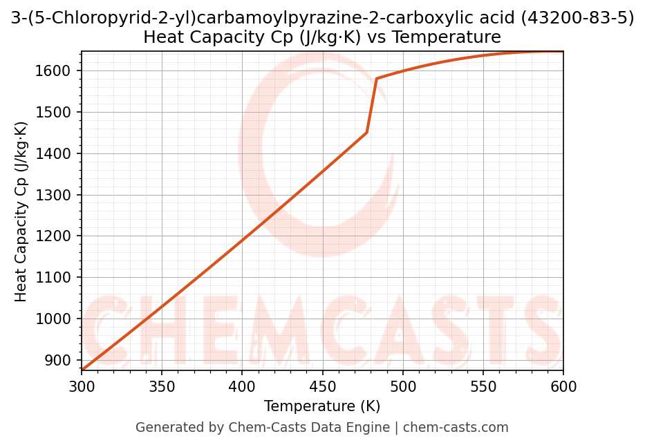 - Specific heat capacity (Cp) indicates the amount of energy required to raise the temperature of 3-(5-Chloropyrid-2-yl)carbamoylpyrazine-2-carboxylic acid and is critical for energy balance and heat-exchanger design.