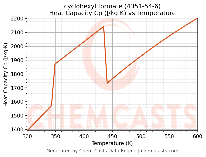 - Specific heat capacity (Cp) indicates the amount of energy required to raise the temperature of cyclohexyl formate and is critical for energy balance and heat-exchanger design.