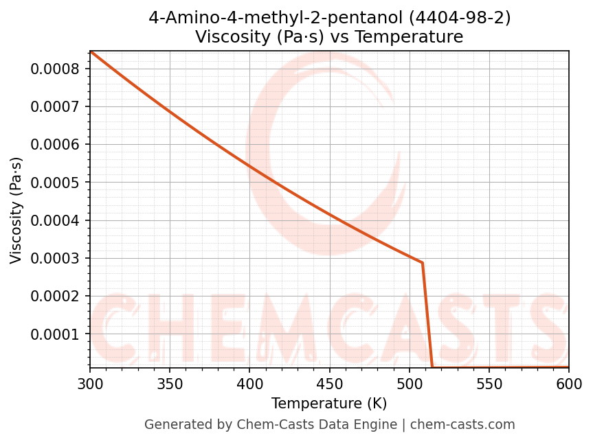 This page presents the temperature-dependent thermodynamic and transport properties of 4-Amino-4-methyl-2-pentanol (CAS 4404-98-2) calculated at a constant pressure of 1 atm (101325 Pa) over the temperature range 250-500 K.