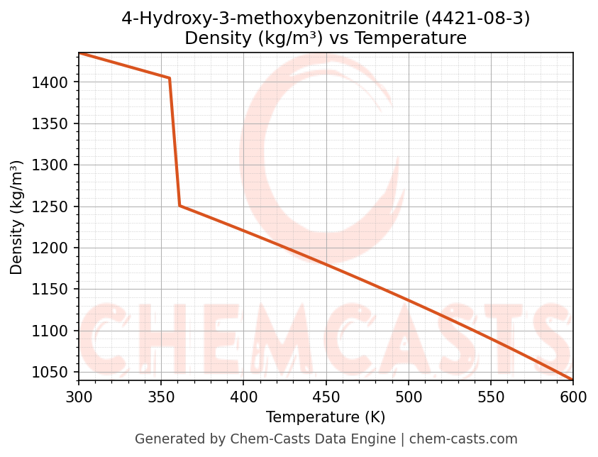 This page presents the temperature-dependent thermodynamic and transport properties of 4-Hydroxy-3-methoxybenzonitrile (CAS 4421-08-3) calculated at a constant pressure of 1 atm (101325 Pa) over the temperature range 250-500 K.