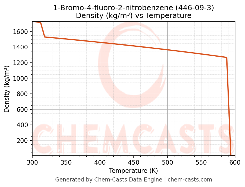 This page presents the temperature-dependent thermodynamic and transport properties of 1-Bromo-4-fluoro-2-nitrobenzene (CAS 446-09-3) calculated at a constant pressure of 1 atm (101325 Pa) over the temperature range 250-500 K.