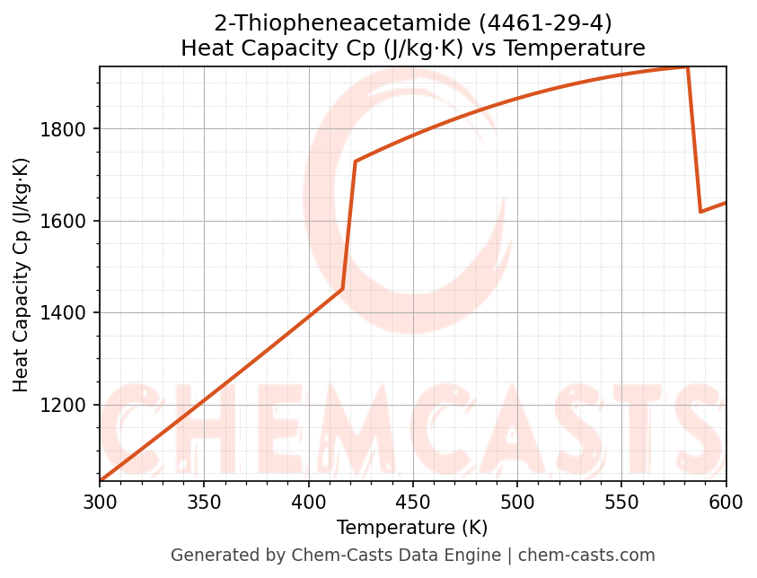This page presents the temperature-dependent thermodynamic and transport properties of 2-Thiopheneacetamide (CAS 4461-29-4) calculated at a constant pressure of 1 atm (101325 Pa) over the temperature range 250-500 K.