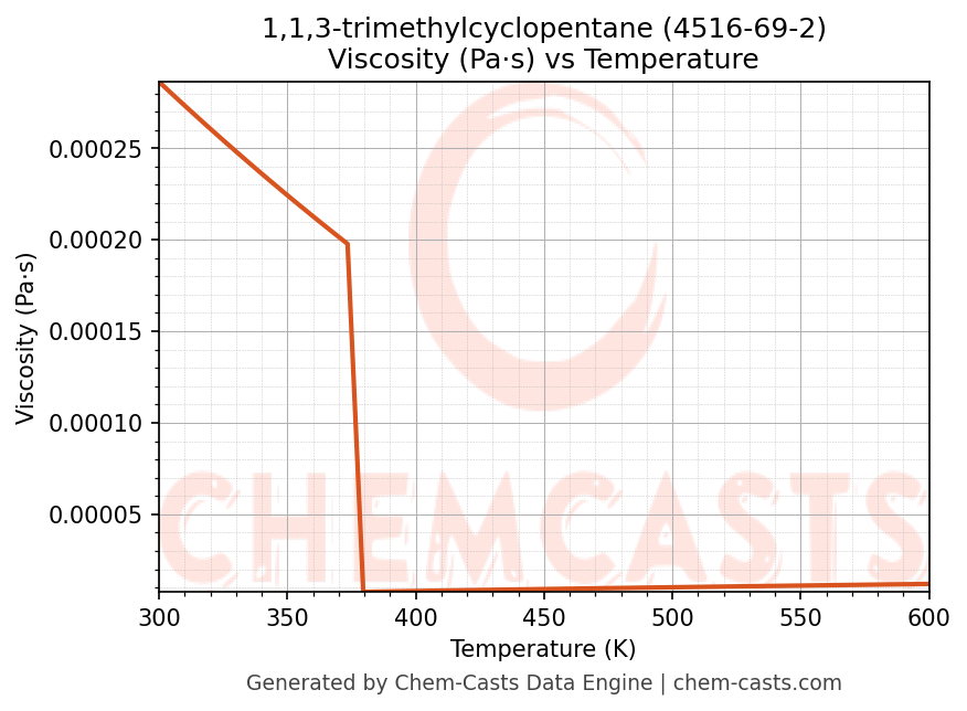 This page presents the temperature-dependent thermodynamic and transport properties of 1,1,3-trimethylcyclopentane (CAS 4516-69-2) calculated at a constant pressure of 1 atm (101325 Pa) over the temperature range 250-500 K.