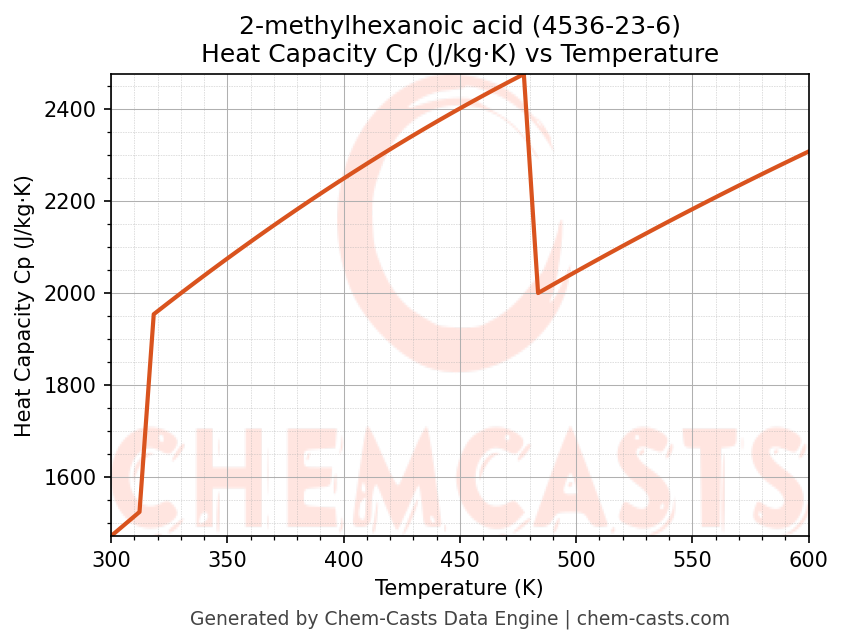 - Specific heat capacity (Cp) indicates the amount of energy required to raise the temperature of 2-methylhexanoic acid and is critical for energy balance and heat-exchanger design.