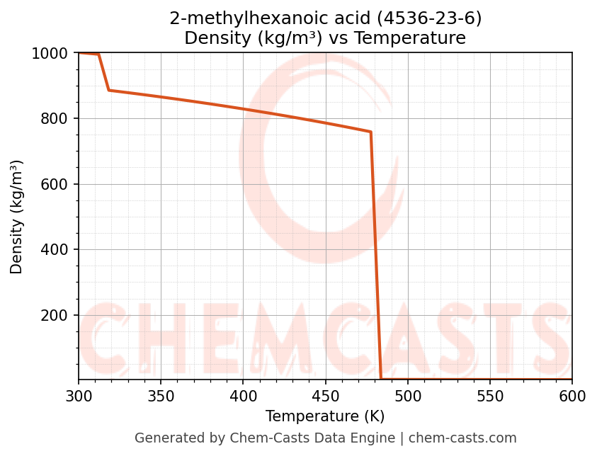 This page presents the temperature-dependent thermodynamic and transport properties of 2-methylhexanoic acid (CAS 4536-23-6) calculated at a constant pressure of 1 atm (101325 Pa) over the temperature range 250-500 K.