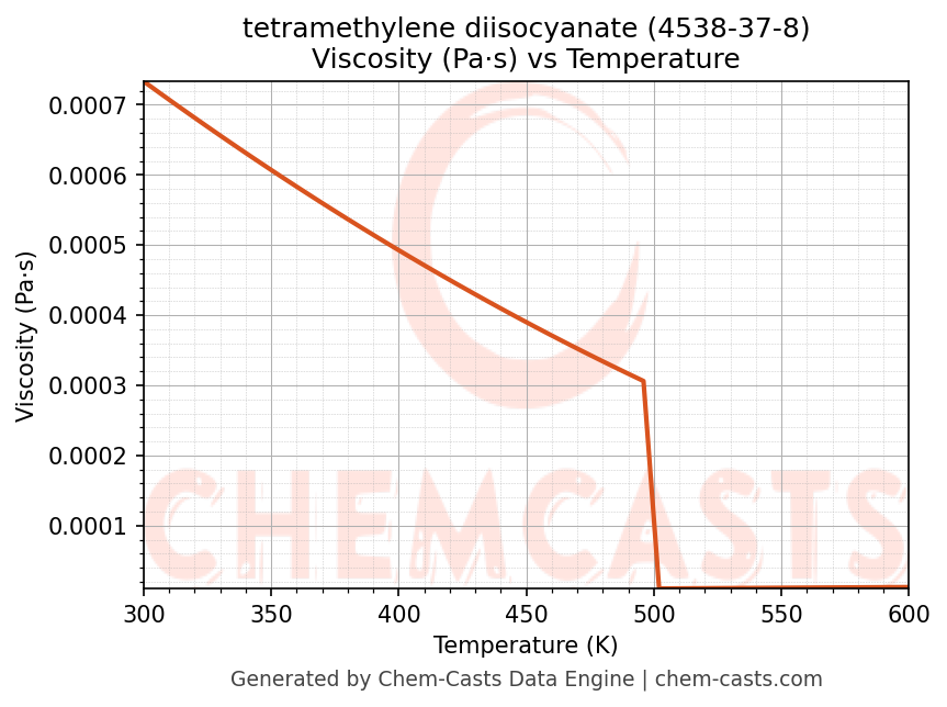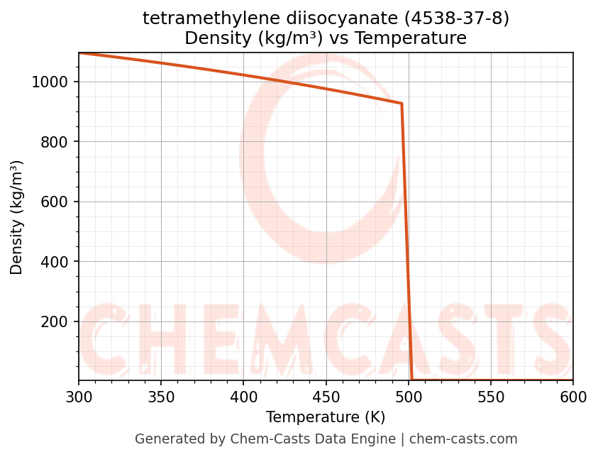 This page presents the temperature-dependent thermodynamic and transport properties of tetramethylene diisocyanate (CAS 4538-37-8) calculated at a constant pressure of 1 atm (101325 Pa) over the temperature range 250-500 K.