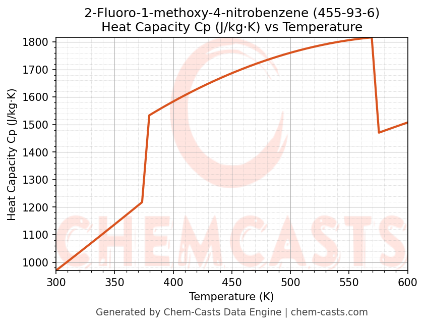 - Specific heat capacity (Cp) indicates the amount of energy required to raise the temperature of 2-Fluoro-1-methoxy-4-nitrobenzene and is critical for energy balance and heat-exchanger design.