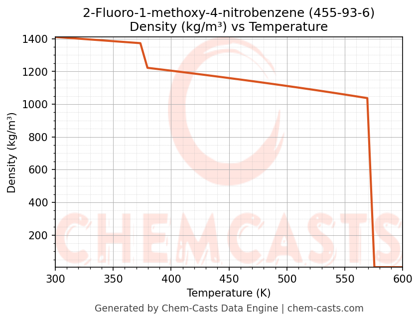 This page presents the temperature-dependent thermodynamic and transport properties of 2-Fluoro-1-methoxy-4-nitrobenzene (CAS 455-93-6) calculated at a constant pressure of 1 atm (101325 Pa) over the temperature range 250-500 K.